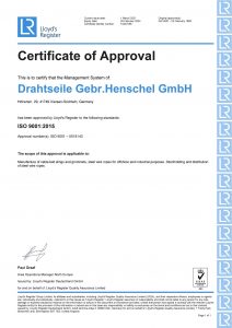 Drahtseile Gebrüder Henschel got Lloyd’s Register’s customer-ID 252 and received the first ISO 9000 certificate in 1988 and became the first certified company in steel wire rope business in Germany.